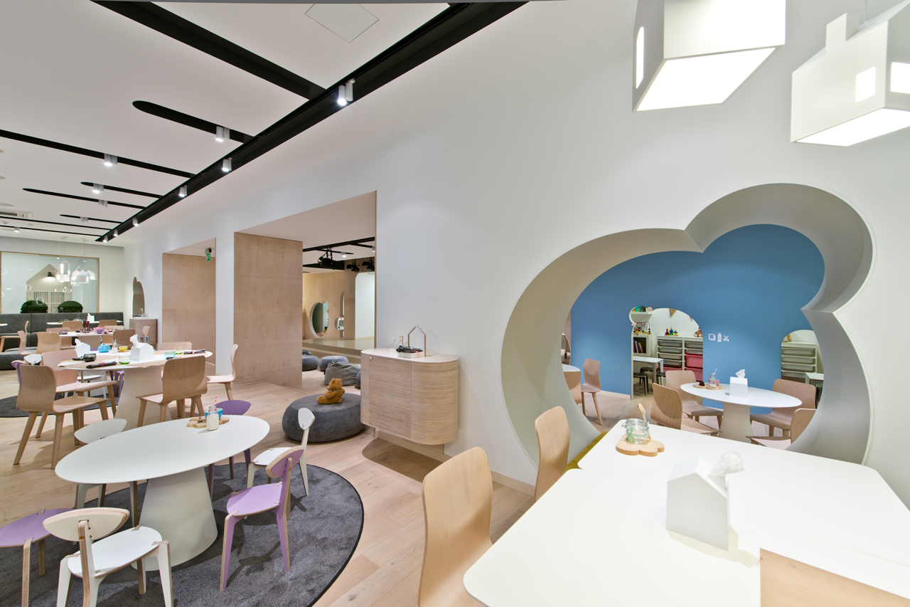 Questa sensazione di comfort e positività è accentuata dalla palette cromatica tutta giocata sui toni neutri che caratterizzano l’involucro e gli arredi, per esaltare la presenza dei bambini; la loro curiosità è stimolata dagli stessi elementi architettonici – fessure di varie forme nei divisori che mettono in comunicazione i vari ambienti – dalle decorazioni astratte sulla parete di fondo e dalle sedute di forme e materiali differenti.
