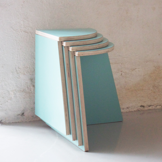 I quattro sgabelli, se uniti tra loro, creano diverse composizioni; se invece non vengono utilizzati, possono essere agevolmente impilati o nascosti sotto il tavolo.
